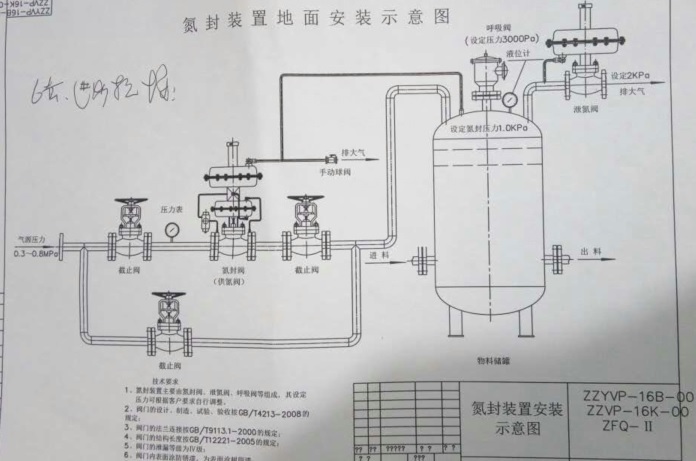 ▲ 對于應(yīng)用于儲罐氮封的調(diào)壓閥取壓點應(yīng)直接取自于罐頂,因為只有這樣才能充分發(fā)揮調(diào)壓閥的輸出流量來滿足氮封流量的需求,使罐頂保持相對于大氣壓的微正壓。儲罐上一般安裝呼吸閥與調(diào)壓閥配套使用,在正常使用時儲罐靠調(diào)壓閥吸氣,靠呼吸閥排氣,當(dāng)調(diào)壓閥故障或氮氣中斷時,呼吸閥可吸氣以保護儲罐不致吸癟。
