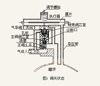 如圖1所示,當氮封閥關閉時,主閥的活塞是在一個密封室內,當儲罐壓力等于或大于設定的壓力時,膜片就被向上頂起,氣導閥在彈簧的作用下向上移動,把氣導閥上的密封圈緊緊壓在閥座上,關閉了控制氣的進口,同時特殊閥芯室的壓力增加并接近氮氣總管的壓力,此壓力通過內部通道,從特殊閥芯室傳到主閥閥芯室。主閥的活塞就處于氮氣總管壓力的作用,由于主閥閥芯上、下所受氣體壓力平衡,所以主閥閥芯在自重和彈簧的作用下將閥門緊密關死。